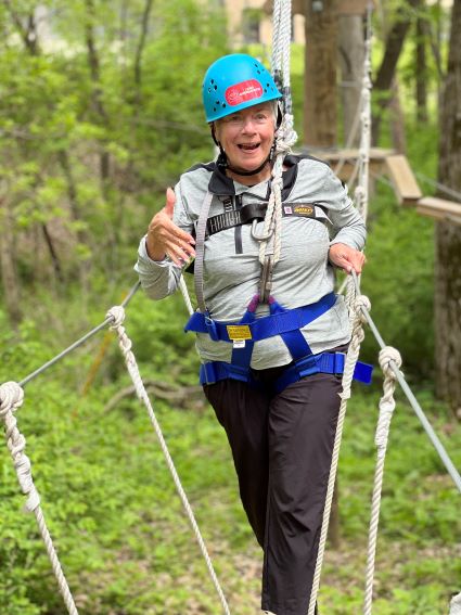 “They make all of the activities accessible for anyone that comes,” says Oaknoll Recreational Therapist Lindsey Reed. She says residents canoe, paddle boat, bowl, take train rides around the camp, and visit the camp’s animals. The highlight for many is the Burma Bridge, Camp Courageous’ ropes course, built to accommodate all ages and abilities.