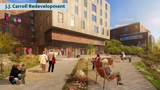 The old J.J. Carroll buildings were torn down last year, and the new building, estimated to cost $85 million, is scheduled to open in 2023. 2Life Communities will own the building with a 99-year ground lease, while BHA will own the land. The residents in the old J.J. Carroll building were moved out last year and all have the right to return to the new community. Many are living on 2Life’s Brighton campus next door, while others relocated to other BHA properties.