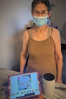 Lynn benefits from many forms of technology, including a smartphone, an Amazon Echo, and an iPad. Most recently, she was able to find and adopt Molly, her dog, at a local shelter. Lynn also uses technology to commute by using Uber, to stay in touch with family through Facebook, to shop online, and to have her groceries delivered. The device she used most during the pandemic was her iPad—which she would not have been able to afford without the iPad program. Friends would meet with her remotely via Zoom, and Lynn also helped Eaton’s Life Enrichment Department set up Zoom bingo.