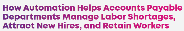 A massive labor shortage is gripping corporate America. Higher wages, fat signing bonuses, staff training and other enticements only go so far with job seekers and employees. The key to attracting and retaining top talent in the finance office is to digitally transform the Accounts Payable (AP) function into a more rewarding and strategic role, where staff have the automated, personalized tools that they need to be productive anywhere. Click here to read the full article.